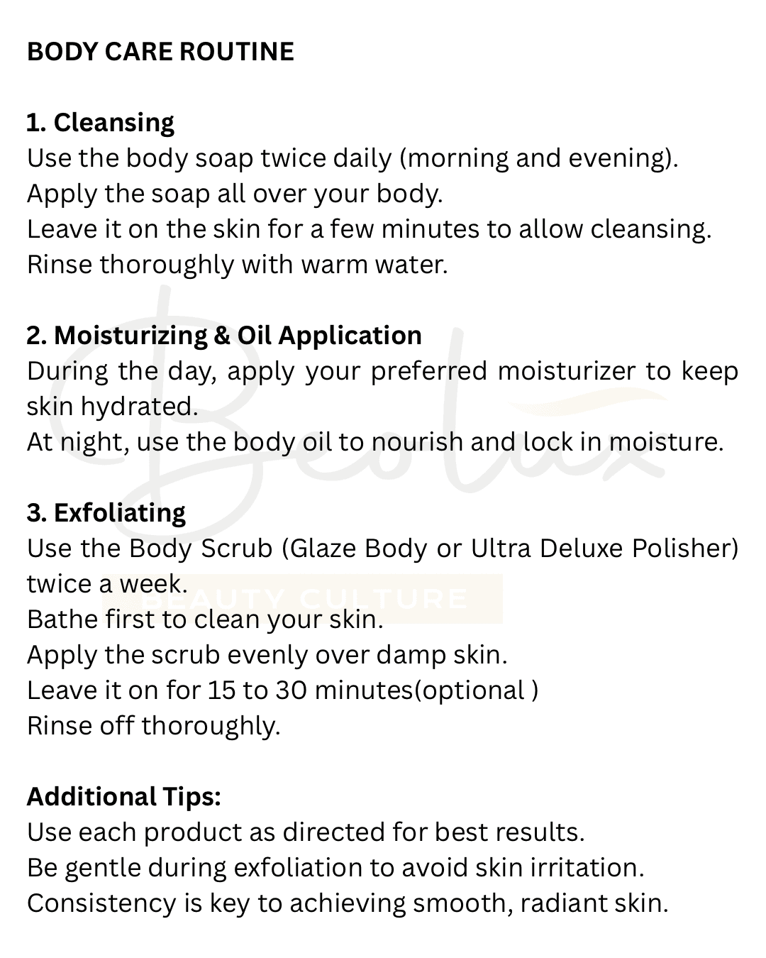 Use the Body Scrub (Glaze Body or Ultra Deluxe Polisher) twice a week.